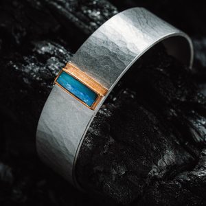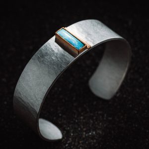 Handgeschmiedeter Armreif in Silber. Um die Einzigartigkeit zu betonen bleibt der „Hammerschlag“ erhalten und sichtbar. Der verwendete Edelstein ist ein australischer Opal welcher in Feingold gefasst ist. Ein zusätzlicher Feingoldstreifen unterstreicht die Form des Steines.