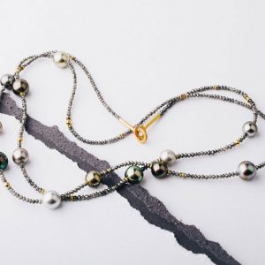 Halsschmuck bestehend aus Diamanten, insgesamt etwa 35ct, sowie aus unterschiedlichen Thaiti Perlen und Gold 750. Die Kette kann lang (ca 86cm) oder doppelt getragen werden. Die Diamanten funkeln durch die Bewegung und Bilden einen wunderschönen Kontrast zu den Perlen in unterschiedlichen Größen und Grautönen.
