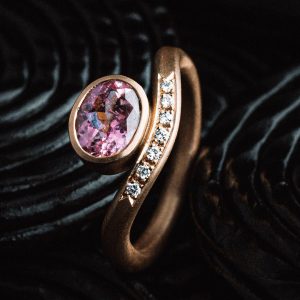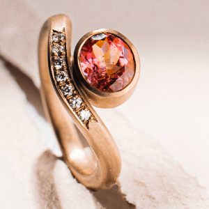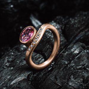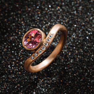 Der verarbeitete rote Turmalin, auch Rubellit genannt, kommt aus Brasilien. Die Fassung ist an die Ringschiene gelötet und bildet einen perfekten Kontrast zu der weichen Form des Goldringes in Verbindung mit 7 eingelassenen Brillanten.