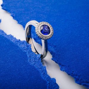 Ring in Platin Pt 960/ooo mit einem Kornblumenblauen Saphir mit 1,04 ct sowie einen ihn umgebenen Kreis aus Brillanten mit insgesamt 0,12ct. Der Ring kann perfekt mit einem zweiten kombiniert werden da die Fassung oberhalb der Ringschiene montiert ist und sich ein zweiter Ring absolut harmonisch integriert.